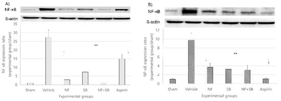 NF-κB is a family of ubiquitously expressed, eukaryotic transcription factors that participate in the regulation of multiple immediate genes expressed at the onset of many vital biological processes, such as cell growth, immunoregulation, apoptosis, and inflammation [38,39]. The importance of the role of NF-κB in initiating a potent inflammatory response cannot be better signified than recognizing that the B consensus sequence is found in the promoter/enhancer regions of more than 50 diverse genes whose expression is known to be crucial in driving an inflammatory response [40,41,42]. At the 7th and 14th day after injury, a western blot analysis was performed on the sciatic nerve. In the vehicle group, NF-κB expression increased compared to the sham group at the 7th and 14th day. However, the expression of NF-κB showed a significantly suppressive effect in the NF (p < 0.01), SB (p < 0.01), and NF + SB (p < 0.01) treated group at the 7th (Figure 8A) and 14th (Figure 8B) day compared to the vehicle group.