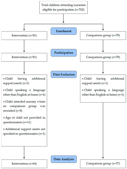 Participants in the BCLC sessions were recruited and sessions delivered on site at the interested nine nurseries between October 2017 and May 2018. The comparison group was recruited in Summer 2018 and Spring 2019. Data were collected from intervention participants at nine council-based nurseries; however, one nursery was excluded from the data analysis as no comparison participants could be recruited.