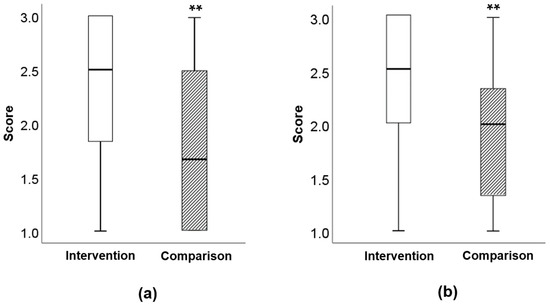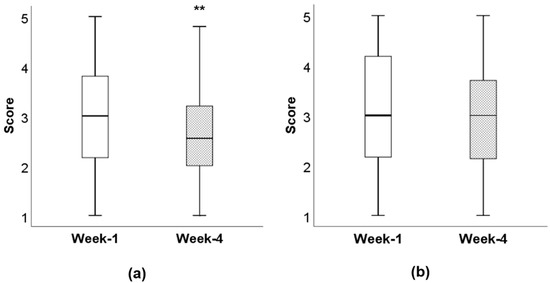 Food fussiness scores at week 1 and time week 4: (a) food fussiness scores in the intervention group at week 1 and week 4, ** p = 0.002. (b) Food fussiness scores in the comparison group at week 1 and week 4, p = 0.400. Scores are an average of six items; scores ranged from 1 to 5 for “completely disagree” to “completely agree”.