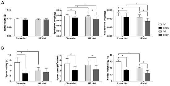 Reproductive organ weights and semen quality in high phosphorus diet-fed mice with or without CKD induction. (A) Testis, epididymis, and vas deferens weight, and (B) parameters of semen quality. Data are expressed as the mean ± SD. # indicates a significant difference between the sham-operated and CKD-induced groups (SC vs. CKDC and SP vs. CKDP); * indicates a significant difference between the chow diet and high phosphorus diet-fed groups (SC vs. SP and CKDC vs. CKDP).