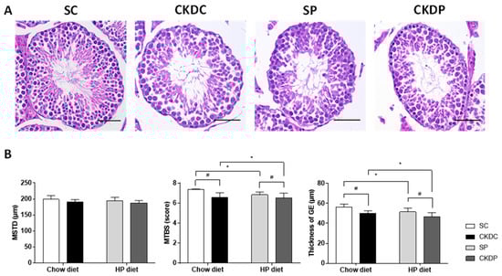 Testicular morphology and related parameters in high phosphorus diet-fed mice with or without CKD induction. (A) Testicular morphology, (B) mean seminiferous tubule diameter (MSTD), mean testicular biopsy score (MTBS) and thickness of the germinal epithelium (GE). Data are expressed as the mean ± SD. # indicates a significant difference between the sham-operated and CKD-induced groups (SC vs. CKDC and SP vs. CKDP); * indicates a significant difference between the chow diet and high phosphorus diet groups (SC vs. SP and CKDC vs. CKDP).