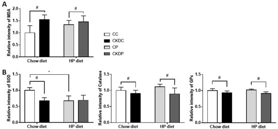 Analysis of testicular antioxidants revealed markedly decreased activities of SOD and GPx in the CKDC group, and Catalase and GPx in the CKDP group, as compared with the sham groups (SC and SP). Contrary to the sham-operated mice fed the standard chow diet, the SOD activity was much lower in the mice fed a HP diet. Moreover, an increased content of MDA in the CKD-induced group was observed, indicating an adverse effect of CKD on the testicular antioxidative system (Figure 5).