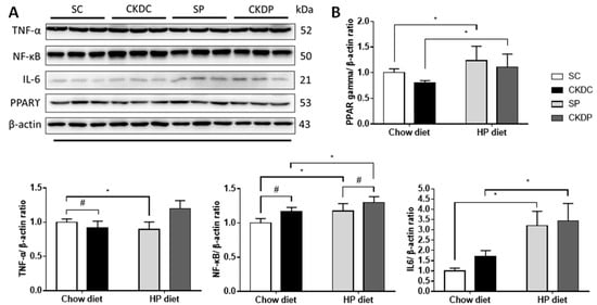 Protein expressions of testicular inflammation pathway markers in high phosphorus diet-fed mice with or without CKD induction. (A) Protein expressions of inflammation pathway markers (TNF-α, NF-κB, IL-6 and PPARγ) and β-actin was used for normalization; (B) relative density analysis of the protein bands. Data are expressed as the mean ± SD. # indicates a significant difference between the sham-operated and CKD-induced groups (SC vs. CKDC and SP vs. CKDP); * indicates a significant difference between the chow diet and high phosphorus diet groups (SC vs. SP and CKDC vs. CKDP).