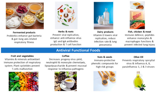 Viral infections are characterized by a compromised immune function and deficient micronutrient stores, particularly vitamins, including vitamins A, B6, B12, C, D, E, and folate, and trace elements, including zinc, iron, selenium, magnesium, and copper [7]. Evidence already supports an efficient function of the immune system through consuming those various nutraceuticals within a variety of functional foods including essential fatty acids, linoleic acids, essential amino acids, and the aforementioned vitamins and minerals, especially where forms of immunity may be affected by deficiencies in one or more of these nutraceuticals [43,44]. Adequate dietary intake, and supplementation of such functional foods, contribute to maintaining optimal levels in the human body, which enhances several aspects of the immune system [7,45], and provides an important antiviral prevention of COVID-19 [46]. Conversely, less robust immune responses have been shown to be the primary risk factor for COVID-19 [47], which makes it timely to describe the protective role of functional food component benefits in the context of preventing COVID-19 and seasonal infections.