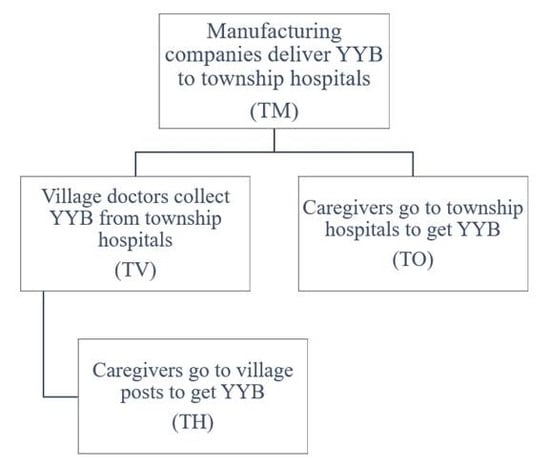 The transportation costs in province p and for poverty status k were denoted Tp,k, which included the delivery costs from manufacturing companies to eligible households. Tp,k was composed of two parts (Figure 1). The first is the transportation costs from manufacturing companies to township hospitals (TMp), and these costs were borne by manufacturing companies. According to published studies [31,32,33], TMp would vary greatly depending on accessibility and distance to township hospitals, from about 0.9 to 13.5 cents (RMB; 0.3 to 3.8 cents ($)) per YYB pack. Second, the costs from township hospitals to households, which could be materialized in two ways depending on the delivery type. There were two main ways to deliver YYB, denoted “Delivery Type 1” and “Delivery Type 2” [31]. Delivery Type 1 corresponds to the situation where village doctors come to the hospitals every month to collect YYB, and village health posts serve as the distribution location for caregivers to obtain YYB for their children. The costs borne by the village doctors (TVp in province p) would be subsidized by the government [31]. We accounted for the time losses borne by the caregivers (THp,k, for households of wealth status k in province p). Delivery Type 2 corresponds to the situation where caregivers come to township hospitals monthly to get YYB at their own expenses (TOp,k).