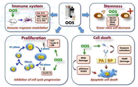 The molecular mechanism of action of OOS in several preclinical models has been described and involves regulation of cell proliferation by blockage of S phase and G2-M transition. OOS also induces caspase-dependent cell death which leads to PARP cleavage. As a consequence of the apoptotic process, DNA damage occurs and this is readout by increases in pHistone H2AX. OOS also inhibits stemness and self-renewal as indicated by the down-regulation of several stem-cell markers. Finally, an important action of OOS is related to the modulation of the immune system, as indicated by changes in the production of several cytokines. IL6: interleukin-6; IL10: interleukin 10; IFNα: interferon alpha; TNFα: tumor necrosis factor alpha; IL1β: interleukin-1 beta; Cox2: cyclo-oxygenase-2; IL12: interleukin 12; IFNγ: interferon gamma; CD133: cluster of differentiation 133; CD44: cluster of differentiation 44; SOX2: sex determining region Y-box 2; RB: retinoblastoma protein; PARP: Poly-ADP Ribose Polymerase.