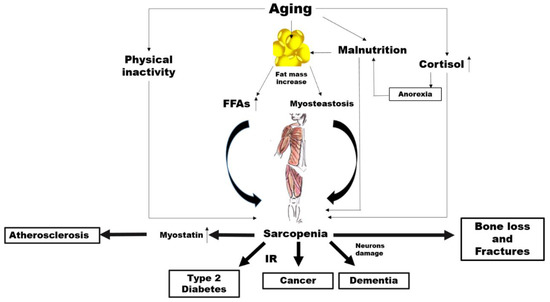Of course, it is possible that changes in lean body mass represent both a risk factor and a consequence of impaired glucose states, irrespectively of changes in total body fat. In addition, physical inactivity, which is a common feature of ageing, is associated with a decline in mitochondrial oxidative function in the muscle [77], which involves a reduced capacity to oxidize fatty acids leading, again, to IR [77]. It is well known that IR characterizes the metabolic syndrome, which is a condition preceding frank diabetes [78]. There is also a strong correlation between insulin resistance and the risk of developing CVD [79]. Furthermore, IR seems to be closely associated with the increased incidence of and/or mortality from a broad range of cancers such as breast [80], colorectal [81], pancreatic [82] and liver [83] cancer. A first mechanism linking sarcopenia to NCDs might thus involve IR.