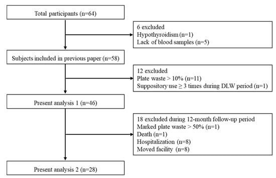 In total, 64 older residents who could eat without assistance were recruited from five long-term care facilities in metropolitan Tokyo, Japan. The exclusion criteria were outlined in the previous article [10]. In this study, some participants were excluded from the analyses in accordance with the two aims of the study; a flowchart of the exclusion criteria is shown in Figure 1. We have previously published a paper including 58 older residents in the baseline survey [10]; we then excluded 11 participants who left >10% of their food to minimize the errors of plate waste by visual estimation, and one participant who used ≥3 suppositories during the baseline survey (analysis 1). In addition, 18 participants were excluded due to marked plate waste (n = 1), death (n = 1), hospitalization (n = 8), or moving facilities (n = 8) during the follow-up period (analysis 2).