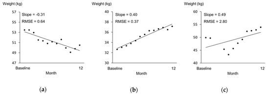 The Shapiro–Wilk test was used to evaluate the normality of the data. Data of analysis 1 are expressed as mean ± SD, and data of analysis 2 are expressed as median and range (min–max). Differences between the energy variables in analysis 1 were compared using the paired t-test, and the agreement between OEI and TEIDLW was assessed using Bland and Altman plots [22]. The limits of agreement were plotted and defined as 1.96 SD of the difference above and below zero. Before the statistical analysis of analysis 2, it was necessary to clarify two assumptions. First, facility staff measure the weight for residents every month in Japanese long-term care facilities. However, it is unclear how accurately these weights are measured because there is no manual for measurement of weight and their weight is assumed to be often measured with or without something in their pocket, wearing shoes, and/or wearing a heavy jacket. Therefore, researchers also measured the weight of residents with light clothes, no shoes, and empty pockets, and we needed to compare both weights to examine the accuracy of the weight measured by facility staff. The inter-rater reliability of the weight measurement between the researcher and facility staff was examined by intra-class correlation coefficient at baseline and 6 months and 12 month later. Second, the subjects in analysis 2 were followed up from baseline to 12 months and had no acute exacerbations or marked plate waste. It was hypothesized that the weight would change at a constant rate; therefore, the slope of the regression line of weights measured once a month over 12 months was used to assess the weight changes, where a negative and positive slope defined weight loss and gain, respectively (Figure 2). We also calculated the root mean square error of variation (RMSE) to support the above hypothesis. The RMSE is used as an indicator of weight variability [23] and calculated around each resident’s regression line for monthly weight changes in the present study. In the second analysis, the relationship between the energy gap and the slope of weight change was examined by Spearman’s rank correlation coefficient. Differences in variables between the weight loss and gain groups were compared using the Mann–Whitney U test. All statistical analyses were performed using SPSS for Windows 15.0 (SPSS Inc., Chicago, IL, USA). Significance was set at p = 0.05.