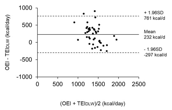 Bland Altman plots showing the difference between the observed energy intake (OEI) and total energy intake determined using the doubly labeled water (DLW) method (TEIDLW) in reference to the mean (n = 46). The solid line shows the mean difference, while the dotted lines represent the limits of agreement (± 1.96 SD) from the mean difference.