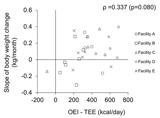 The data of 28 subjects were analyzed to examine the relationship between the energy gap (OEI-TEE) at baseline and the subsequent change in weight during the 1 year follow-up period. All body weights measured by the facility staff at baseline and 6 months and 12 months later were a little higher than those measured by the researchers; the differences in body weight were 0.54 ± 1.52 (kg), 0.50 ± 0.65 (kg), and 0.80 ± 1.31 (kg), respectively. The intra-class correlation coefficients indicated good reliability (ICC = 0.977, 0.996, and 0.980, respectively); thus, body weight recorded by the facility staff is considered to be reliable. The RMSE values of the subjects ranged from 0.31 to 1.52. The case who was excluded, as outlined above, had a RMSE of 2.80 (Figure 2c). Therefore, in comparison, the subjects in analysis 2 were considered to have no rapid change in weight. The energy gap tended to be correlated with the slope of weight change (ρ = 0.337, p = 0.080) (Figure 4). Although the difference obtained by subtracting TEE from OEI was positive in most subjects (n = 27), seven older residents lost weight after 1 year, despite the fact that their energy gaps were positive.
