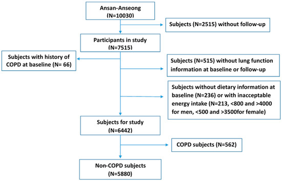 The study used the data from one of the community-based Korean Genome Epidemiology Study (KoGES) cohorts, namely the Ansan-Ansung cohort, and the detailed study design and procedures are reported elsewhere [11]. Spirometry was measured by three well-trained pulmonary technologists in concordance with the 1994 American Thoracic Society recommendation, using a spirometer (Vmax-229,Sensor-Medics, Yorba Linda, CA, USA) for all subjects. The predicted forced expiratory volume in one second (FEV1) were measured using a standardized method. To evaluate the lung function, we used the difference of FEV1 (diff FEV1) from baseline (from May 2001 to February 2003) to follow-up (from February 2005 to November 2007) data. Prior informed consent was obtained from each participant during the recruitment and subsequent visits, which were approved by the Human Subjects Committee of Korea. The Korean National Institute of Health Institutional Review Committee approved the study procedures. Study procedures were in accordance with institutional guidelines and were approved by the Kangwon National University Hospital institutional review committee (IRB No. 2013-07-006) for the ethical approval. From the baseline (N = 10,030), subject with lost to follow-up (F/U) (N = 2515) couldn’t be included in the study. The distribution of ecological factors between eligible population and follow-up loss was presented in Supplementary Table S1. We excluded the participant who had a history of COPD at baseline (N = 66), without lung function information (FEV1) at baseline or F/U (N = 515), with unacceptable energy intake (less than 800 kcal or more than 4000 kcal for men and less than 500 kcal or more than 3500 kcal for women, N = 213), and without dietary information at baseline (N = 236). In addition, participants with COPD diagnosed at recruitment (n = 562) were excluded to eliminate a latent period bias. Finally, 5880 healthy subjects were included in this study (Figure 1).
