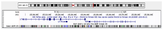 Genomic region 2q21 containing the LCT and MCM6 loci (capture from the University of California, Santa Cruz (UCSC) Genome Browser). Exons are represented with boxes and introns with lines. This capture also includes information for all the known single nucleotide polymorphisms (SNPs) mapping the region, according to the dbSNP v153.