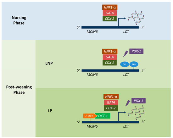 Genetic mechanisms underlying lactose persistence (LP) and lactase non-persistence (LNP) in humans. Rectangular shapes represent all the transcription factors currently known to interact with the lactase gene (LCT) promoter. While CDX-2, HNF1-α, GATA, and OCT-1 are known to promote LCT expression, the PDX-1 has been described as a transcriptional repressor. Oval shapes (named as “CH3”) refer to the appearance of methylations within the LCT region, which have also been described as repressing LCT expression. Finally, the different LP-associated alleles described in MCM6, and responsible for binding to OCT-1, are represented in orange. CDX-2: caudal type homeobox 2; HNF1-α: hepatocyte nuclear factor 1α; OCT-1: octamer-binding protein 1; PDX-1: pancreatic and duodenal homeobox 1.