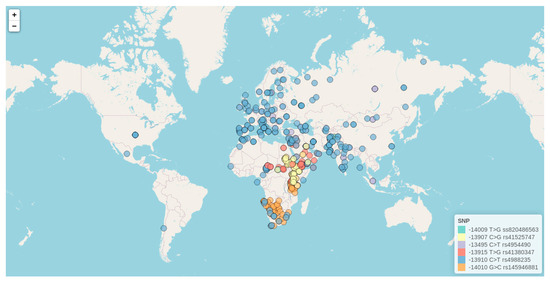 Of the twenty-three genetic variants included in Table 1, there are ten with a rare frequency (q < 5%) in the populations where they were discovered, as well as another SNP in complete linkage disequilibrium (LD) with the well-known −13.910:C>T. For the remaining twelve frequent and widely studied SNPs, we have created a database including all available information for minor allele worldwide frequencies reported till July 2020 in the literature (Supplementary Table S2). For the most genotyped variants among these twelve markers (those SNPs that have been studied in more than ten different populations around the world), we have further created an interactive map following the same format as the one previously presented for LP phenotype data. The six genetic variants represented in the interactive map comprise −13910:C>T (rs4988235), −13495:C>T (rs4954490), −14009:T>G (rs869051967), −13907:C>G (rs41525747), −13915:T>G (rs41380347), and −14010:G>C (rs145946881)), for which we further include information related to ethnicity, number of genotyped individuals, reported minor allele frequencies, and literature references. This interactive map is hosted at (http://bionit.ugr.es/pages/investigacion/software/bioinformatics-methods-software) and a static capture is presented in Figure 4. For the construction of such a database and interactive map, genotype data available in the work from Liebert et al. (2017) [9] as well as in any additional genetic study published from 2016 to 2020 have been considered. Owing to that, our map constitutes the first resource presenting distribution data for LP associated alleles in American populations.