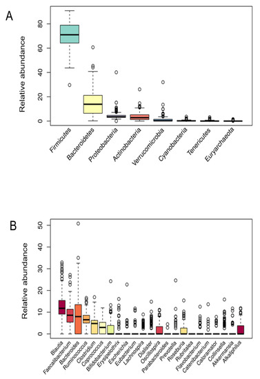 To characterize the bacterial microbiota composition, 16S rRNA gene sequencing on collected fecal samples was performed. In the present cohort study, the microbial profiles of 200 individuals were analyzed. The abundances of 8 bacterial phyla (Figure 1A) and 23 genera (Figure 1B) that were found in more than 10% of study participants are presented in Figure 1. Firmicutes, Bacterioidetes, and Proteobacteria phyla were detected in the microbiota of all participants. Firmicutes was the predominant group at the phylum level (71.02 ± 11.45) followed by Bacteroidetes (13.85 ± 10.20), Proteobacteria (3.52 ± 3.33), Actinobacteria (2.80 ± 3.25), and Verrucomicrobia (0.28 ± 2.87). Moreover, Firmicutes was the most dominant phylum in the vast majority of individuals (98%). Regarding taxonomic classification, the most abundant genera also belonged to Firmicutes phyla (Blautia, Faecalibacterium, Ruminococcus, and Clostridium). In addition to this, most of the bacterial population belonged to the Blautia genus (11.79 ± 5.84), followed by Faecalibacterium (8.59 ± 5.09), Bacteroides (7.97 ± 8.05), Ruminococcus (6.51 ± 3.17), and Clostridium (4.79 ± 3.48).