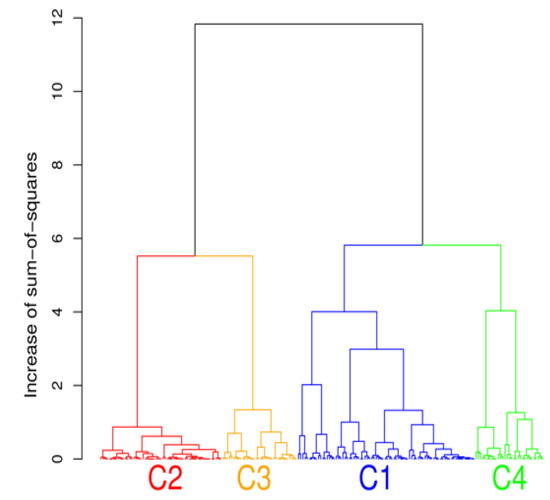 Hierarchical clustering was performed to analyze the microbiota phyla data set. In the tradeoff between having a higher number of clusters, where better focus is achieved but clusters can contain too few variables, and a lower number of clusters with excessive variations, four clusters were selected. Choosing four clusters also resulted in interpretable results. The numbers of members (study participants) in each cluster were 80, 55, 34, and 31 for C1, C2, C3, and C4, respectively. The hierarchical clustering of microbiota data is presented by a tree diagram (dendrogram) in Figure 2.
