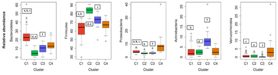 The cluster distribution of five most abundant bacterial phyla. Relative abundance per cluster of the five most abundant bacteria phyla present in our cohort. Each box shows the median plus interquartile range of the relative abundance of bacterial phyla. Colors show the cluster. Statistical significance differences (p < 0.05) between clusters in each phylum are presented with symbols a, b, c, d, e, and f: a, statistical significance (p < 0.05) between C1 and C2. b, statistical significance (p < 0.05) between C1 and C3. c, statistical significance (p < 0.05) between C1 and C4. d, statistical significance (p < 0.05) between C2 and C3. e, statistical significance (p < 0.05) between C2 and C4. f, statistical significance (p < 0.05) between C3 and C4.