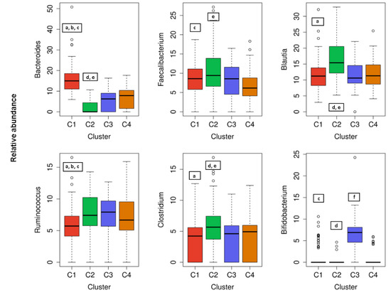 The cluster distribution of six most abundant bacterial and genera. Relative abundance per cluster of the six most abundant bacteria genera present in our cohort. Each box shows the median plus interquartile range of the relative abundance of bacterial genera. Colors show the cluster. Statistical significance differences (p < 0.05) between clusters in each genus are presented with symbols a, b, c, d, e, and f: a, statistical significance (p < 0.05) between C1 and C2. b, statistical significance (p < 0.05) between C1 and C3. c, statistical significance (p < 0.05) between C1 and C4. d, statistical significance (p < 0.05) between C2 and C3. e, statistical significance (p < 0.05) between C2 and C4. f, statistical significance (p < 0.05) between C3 and C4.