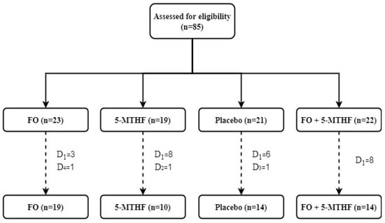 Participant flowchart. FO = fish oil, 5-MTHF = 5-methyl-tetrahydrofolate. Discards, D1 = excessive motion, D2 = previous head injuries, D3 = claustrophobia, D4 = implanted ferromagnetic object.