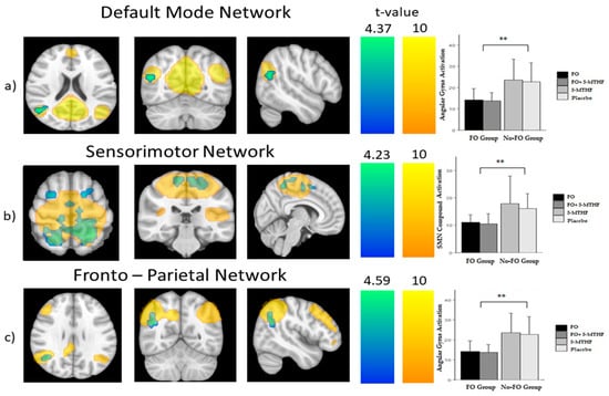Children’s resting-state functional magnetic resonance imaging (fMRI). Voxel-wise significant differences between groups according to maternal supplementation or not with FO during pregnancy. Color bars represent t-value. Warm colors represent the whole brain network, whereas cold colors represented over the networks show the brain areas with significant differences between groups. (a) Default mode network, significant area: angular gyrus; (b) sensorimotor network, significant areas: postcentral gyrus, precentral (left and right) gyrus and putamen; (c) fronto-parietal network, significant area: angular gyrus. (FO: fish oil, 5-MTHF: 5-methyl-tetrahydrofolate). ** PFWE < 0.05.