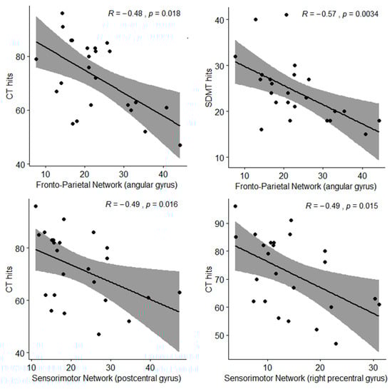 In Table 5, correlations established between RSN scores and neuropsychological results are shown, considering the FO or No-FO groups. No significant results were found between the default mode network (DMN) and the NNB scores. The No-FO group showed a negative association between the angular gyrus within the fronto-parietal network (FPN) regarding SDMT hits (speed-processing domain) and CT hits (attention domain) (See Figure 3). In addition, the No-FO group presented a negative correlation between the precentral (right) and postcentral gyrus within the SMN (sensorimotor network) and CT hits (attention domain) (See Figure 3).