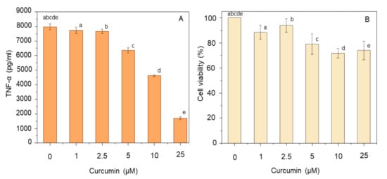 Effect of curcumin dose on TNF-α production (A) and cell viability (B). THP-1 macrophages were pre-treated with 1–25 µM curcumin for 1 h prior to stimulation with 100 ng/mL LPS for 4 h at 37 °C. The level of secreted TNF-α was measured using ELISA, and cell viability was assayed using MTT. Data represent the mean ± standard deviation for three biological replicates. One way ANOVA with Duncan’s post hoc test was used to perform the comparison of means. Means with the same letters are significantly different (p ≤ 0.05).