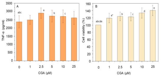 Effect of chlorogenic acid (CGA) dose on TNF-α production (A) and cell viability (B). THP-1 macrophages were pre-treated with 1–25 µM CGA for 1 h prior to stimulation with 100 ng/mL LPS for 4 h at 37 °C. The level of secreted TNF-α was measured using ELISA, and cell viability was assayed using MTT. Data represent the mean ± standard deviation for five * or six biological replicates. One way ANOVA with Duncan’s post hoc test was used to perform the comparison of means. Means with the same letter are significantly different (p ≤ 0.05).