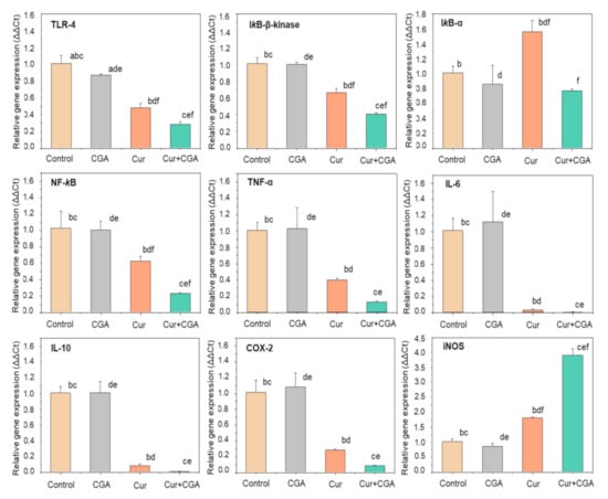 Effect of curcumin (Cur), chlorogenic acid (CGA) and their combination on mRNA expression of inflammatory biomarkers and NF-κB signalling pathway. THP-1 macrophages were pre-treated with curcumin, CGA and their 1:1 combination for 1 h prior to stimulation with 100 ng/mL LPS for 4 h at 37 °C. Expression of mRNAs was quantified using qRT-PCR. Cells treated with LPS, but not with curcumin and/or CGA were used as control. Data represent the mean ± standard deviation for three biological replicates. One-way ANOVA with Duncan’s post hoc test was used to perform the comparison of means. Means with the same letter are significantly different (p ≤ 0.05). a control-CGA; b control-Cur; c control-Cur+CGA, d CGA-Cur; e CGA-Cur+CGA; f Cur-Cur+CGA. TLR-4, toll-like receptor-4; IκB-α, inhibitor of κB-α; NF-κB, nuclear factor kappa-B; TNF-α, tumour necrosis factor-α; IL, interleukin; COX-2, cyclooxygenase-2; iNOS, inducible nitric oxide synthase.