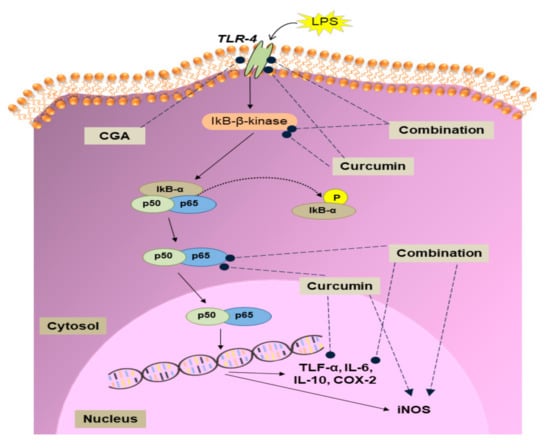 Along with TNF-α, several other pro-inflammatory cytokines (e.g., IL-6), anti-inflammatory cytokines (e.g., IL-10), and enzymes (e.g., COX-2 and iNOS) are also upregulated in response to inflammatory stimuli. The expression of these genes can be controlled by a variety of signalling pathways; including the JNK pathway, p38 MAPK pathway, P13k/Akt pathway and the NF-κB pathway [43]. NF-κB is the principal regulator influencing the expression of more than 500 inflammation-related genes [44]. We, therefore tested the effect of curcumin, CGA and their combination on the mRNA expression of various genes in the NF-κB signalling pathway. In unstimulated cells, the NF-κB protein is present in the cytoplasm and translocates into the nucleus upon activation [45]. In its inactive form, the NF-κB heterodimer is sequestered in the cytoplasm by binding with IκB, an NF-κB inhibitory protein [46]. On exposing the cells to LPS, the TLR-4 receptor is activated causing activation of IκB kinase (IKK), which phosphorylates IκB, targeting it for proteolytic degradation, thereby releasing NF-κB [47], which translocates into the nucleus to increase the transcription of various inflammation-related genes including TNF-α, IL-6, COX-2 and iNOS [46,48]. Our results show that treatment of macrophages with CGA and curcumin in combination resulted in an enhanced anti-inflammatory potential compared to curcumin alone, possibly by suppressing genes in the NF-κB pathway at the mRNA level, likely leading to decreased activity of the pathway. The combination was effective in synergistically downregulating the mRNA levels of both the TLR-4 receptor, and IκB kinase. The combination of curcumin with CGA also synergistically suppressed NF-κB expression. However, the reduction in expression of genes regulated by NF-κB (TNF-α, IL-6 and IL-10) by both compounds together was not significantly different from that seen with curcumin treatment alone. This was very probably due to the fact that these genes were almost fully suppressed by curcumin, leaving little room for an additional effect of CGA. It was expected that the combination treatment would enhance the expression of IL-10, an anti-inflammatory cytokine, but the opposite was observed. This reduction in IL-10 mRNA could be due to suppression of its regulator NF-κB. A similar reduction in COX-2 mRNA was observed on treatment with the combination. The effect of curcumin, CGA and their combination on the mRNA levels of NF-κB signalling pathway components is summarised in Figure 5. Further work will be required to determine if other inflammatory signalling pathways, such as p38-MAPK and JNK, are affected in a similar way.