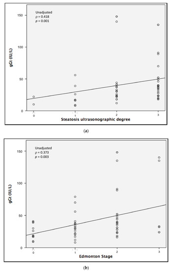 Spearman’s correlation between levels of gamma-glutamyl transferase (gGT) and (a) ultrasonographically measured degree of steatosis or (b) Edmonton stage.
