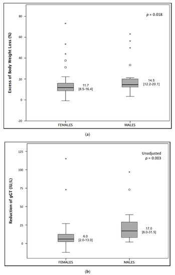 Comparing our primary outcomes, males experienced a significantly larger EBWL and greater reduction in γGT compared to females (Figure 2). The difference in γGT reduction was confirmed after adjustment for baseline levels of γGT (p = 0.003, p for interaction = 0.998).