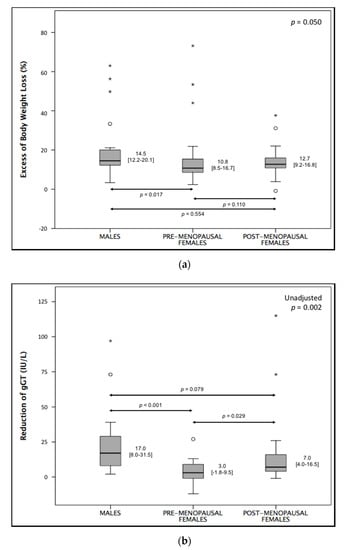 Dividing the female group by menopausal status, the difference among groups in EBWL was borderline significant, with a preserved significant difference between males and pre-menopausal females (Figure 3a). Regarding the reduction in γGT, we found a significant difference among groups, which was lost after correction for baseline γGT levels (p = 0.299, p for interaction = 0.999). Performing comparisons between single groups, we found significant differences between pre-menopausal females and both males and post-menopausal females (Figure 3b). After adjustment for baseline levels of γGT, only the difference between males and pre-menopausal females remained significant (p = 0.022; p = 0.088 for post-menopausal females).