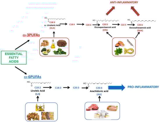 Figure 1 summarizes the essential FAs and their dietary sources. In general, the primary source of ω-3PUFAs in the human diet is marine products, in particular phytoplankton that enters at multiple levels in the food chain [34], fatty fish, and cod liver oil, food rich in DHA and EPA [35,36].