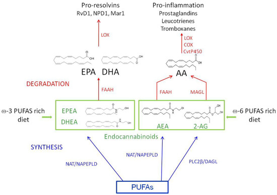 A schematic representation of the metabolic/hydrolyzing pathways linking ω-3 and ω-6, endocannabinoids, and inflammatory mediators. The syntheses of DHEA and EPEA, and AEA from ω-3 and ω-6 PUFAs respectively, requires the activity of N-acetyltransferase (NAT) followed by N-acyl phosphatidylethanolamine-specific phospholipase D (NAPEPLD). The synthesis of 2-AG from ω-6 PUFAs requires the subsequent activity of phospholipase Cβ (PLCâ) and diacylglycerol lipase (DAGL). The hydrolysis of the endocannabinoids requires the activity of the fatty acid amide hydrolase (FAAH) and monoacylglycerol lipase (MAGL). The activity of lipoxygenases (LOX), cyclooxygenase (COX), and cytochrome P450 enzymes (CyP450) drives the production of inflammation mediators. AA: arachidonic acid; AEA: anandamide; 2-AG: 2-arachinonoylglycerol; DHA: docosahexaenoic acid; DHEA: N-docosahexaenoyl ethanolamine; EPA: eicosapentaenoic acid; EPEA: N-eicosapentanoyl ethanolamine; Mar1: maresin 1; NPD1: neuroprotectin D1; PUFA: polyunsaturated fatty acid; RvD1: resolvin D1.