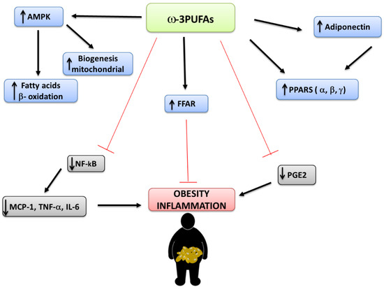 A close link was observed between inflammatory markers, BMI, and body fat percentage. NF-κB, a key transcription factor in gene expression and cytokine inflammation is inhibited by ω-3 PUFAs. Studies in humans and in vitro have shown that ω-3PUFAs are involved in the reduction of cytokines, such as IL-1, IL-6, and TNF-α, whose concentrations are high in cases of obesity [64]. The ω-3PUFAs behave as agonists for numerous free fatty acid receptors (FFARs) typical of different cell types, involved in both the inflammatory response and energy homeostasis. Some unsaturated and saturated long-chain fatty acids can activate FFAR1 and FFAR4 [65]. For example, FFAR4 stimulation prevents lipopolysaccharide (LPS)-mediated release of inflammatory cytokines, such as TNF-α and IL-6 in the macrophage-type RAW264.7 cell line [64].