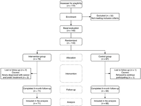 Sample size estimation was carried out considering the change in arterial systolic pressure as the main variable of this clinical trial. To detect a minimum difference of 2.9 mm Hg in systolic arterial pressure between the two groups, 140 participants were required (70 per group), assuming an alpha risk of 0.05, a beta risk of 0.20 in a two-sided contrast and a standard deviation (SD) of 5.8 mm Hg. A follow-up loss rate of 10% was also assumed. These calculations were based on the results obtained in a similar study that reported a decrease of 6.5 ± 5.8 mm Hg in systolic arterial pressure [24]. With the 140 participants included in this study, we obtained a power of 72% for the hypothesis test to detect a statistically significant difference of 6 points in the mean score of the EuroQol Visual Analogue Scale (EQ-VAS) between study groups, assuming an alpha risk of 0.05 in a two-sided contrast.