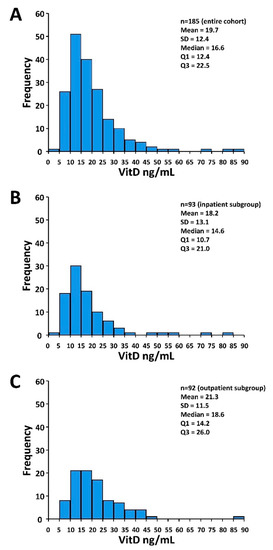 Histograms of the VitD distribution. (A) Entire cohort (n = 185). (B) Inpatient subgroup (n = 93). (C) Outpatient subgroup (n = 92). Abbreviations: Q1 and Q3, first and third quartile, respectively; SD, standard deviation.