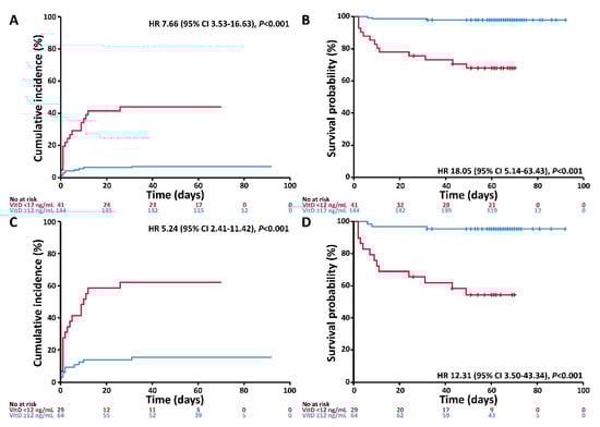 Cumulative incidence of invasive mechanical ventilation and/or death and probability of survival in patients with VitD < 20 versus ≥ 20 ng/mL. (A) Cumulative incidence of the composite event invasive mechanical ventilation and/or death according to VitD status in the entire cohort. (B) Survival probability according to VitD status in the entire cohort. (C) Cumulative incidence of the composite event invasive mechanical ventilation and/or death according to VitD status in the inpatient subgroup. (D) Survival probability according to VitD status in the inpatient subgroup.