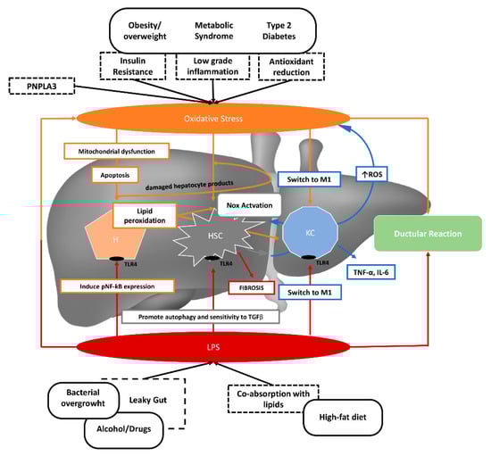 Increased oxidative stress and gut-derived LPS blood levels have emerged as important factors in the pathogenesis of NAFLD and its progression to NASH. All these factors play a major role in proinflammatory molecule release and lipid peroxidation, leading to mitochondrial damage. LPS, the active component of endotoxin, is transported in the blood by chylomicrons and induced by a high-fat diet. However, little is known about factors inducing intestinal barrier alterations, gut bacterial translocation, or the subsequent hepatic TLR4 activation in NAFLD. Moreover, it is not yet clear which factors modulate variations in the intestinal permeability and LPS translocation during the progression to NASH.