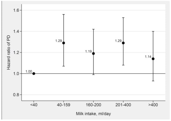 3.2. Associations of Milk and Fermented Milk Intake with PD