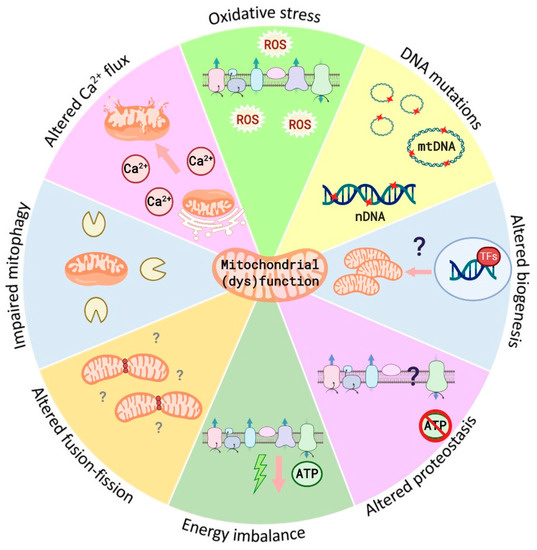 Mitochondrial (dys)function factors. Mitochondrial dysfunction is characterized by the combination of some of the processes described above and plays a central role in several diseases, such as metabolic syndrome. All these processes are closely related, usually affecting one each other and rarely having isolated effects. Oxidative stress leads to the accumulation of reactive oxygen species (ROS). In turn, high amount of ROS might trigger DNA mutations. Mitochondrial (dys)function can also be associated to reduced mitochondrial biogenesis through the decreased expression of mitochondrial genes. Moreover, altered proteostasis (biogenesis, folding, trafficking, and degradation of mitochondrial proteins) is common. Another frequent consequence is an energy imbalance limiting the ATP supply. Furthermore, mitochondrial (dys)function may condition mitochondrial fusion-fission processes compromising mitochondrial renewal and material exchange. Similarly, impaired mitophagy triggers the accumulation of non-functional mitochondria. Finally, mitochondrial altered Ca2+ flux and buffering, disrupt communication with other organelles such as endoplasmic reticulum and, in case of calcium release into the cytoplasm, the potential trigger of cell death.