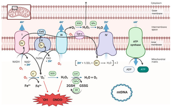 Main sources of mitochondrial reactive oxygen species (ROS). Mitochondrial respiratory chain (MRC) is composed of four enzyme complexes (I–IV). Electrons donated from NADH and FADH2 in the Krebs cycle are transferred at complex I and II respectively, and consecutively to complex III and IV. This electrons transfer is coupled with protons transport across the inner membrane, generating a proton-gradient, allowing ADP phosphorylation through ATP synthase (complex V). Oxygen metabolism generates superoxide anion (·02−), which in turn is conversed into hydrogen peroxide (H2O2) by SOD (superoxide dismutase) and then converted into water thanks to the action of some of the antioxidant enzymatic defenses such as catalase (CAT) or the glutathione peroxidase (GPx) reductase (GPr) system. Excessive ROS production can oxidize proteins, lipids, or mitochondrial DNA (mtDNA), eventually leading to mitochondrial dysfunction and cell death.