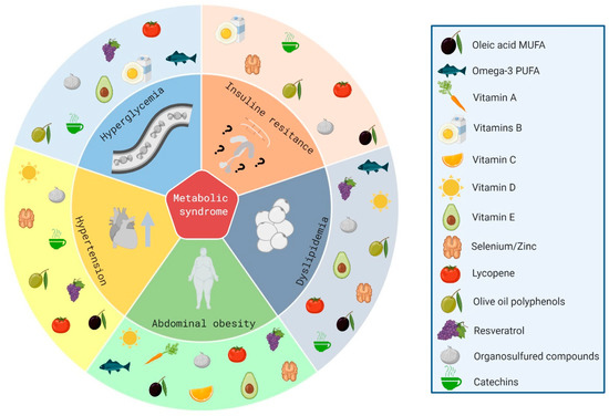 Main nutrient impact on metabolic syndrome (MetS) components. The MetS is a constellation of pathologic conditions which includes hyperglycemia, insulin resistance, dyslipidemia (hypertriglyceridemia and low high density lipoprotein (HDL)-cholesterol levels), central obesity, and hypertension. Several studies have demonstrated that nutrients such as oleic acid monounsaturated fatty acid (MUFA), omega-3 polyunsaturated fatty acids (PUFAs), vitamins A, B, C, D, and E, selenium and zinc elements, lycopene, olive oil polyphenols, resveratrol, organosulfured compounds, and catechins have a positive impact on MEtS components, improving the onset and development of the disease.