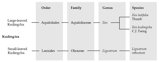 Approximately 12 species belonging to up to six families and six genera are collectively named “Ku-Ding-Cha” [2]. The two most commonly found plant species that are used for the tea can be divided into the groups “large-leaved Ku-Ding-Cha” and “small-leaved Ku-Ding-Cha”. Small-leaved tea belongs to the family Oleaceae and includes species from the genus Ligustrum. The large-leaved Kudingcha contains, amongst others, the genus Ilex with its representative species Ilex latifolia Thunb and Ilex kudingcha C.J. Tseng, who have very similar botanical characteristics [1,13]. In addition, there are reports about KT and the species Ilex kaushue S.Y. Hu, Ilex pentagona S.K. Chen, Y.X. Feng et C.F. Liang and Ilex cornuta Lindl. et Paxt., whereby I. kaushue appears to be the same species as I. kudingcha and I. pentagona has been mistakenly classified in the large-leaved Kudingcha group. Presently, I. cornuta is known as “Gougucha” and was therefore removed from the KT classification [13]. However, the large-leaved genus Ilex from the family Aquifoliaceae was attested to be the original Kudingcha species [1,13] and is, besides Ligustrum, the most commonly drank Kudingcha category in China [14]. An overview of the classification of the most popular KT species is given in Figure 2.
