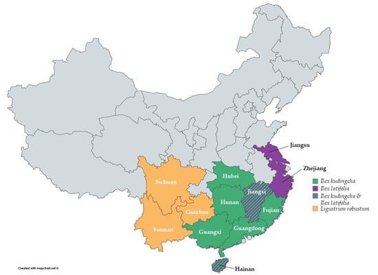The different species of Kudingcha are distributed throughout China across diverse provinces (Figure 3). I. kudingcha has been mainly found in the provinces Fujian, Guangxi, Guangdong, Hainan, Hunan, Hubei and Jiangxi [1,13,15], while I. latifolia is commonly found in Hainan, Jiangxi, Jiangsu and Zhejiang [1,16,17]. Ligustrum robustum has been found in Guizhou, Yunnan and Sichuan [1].