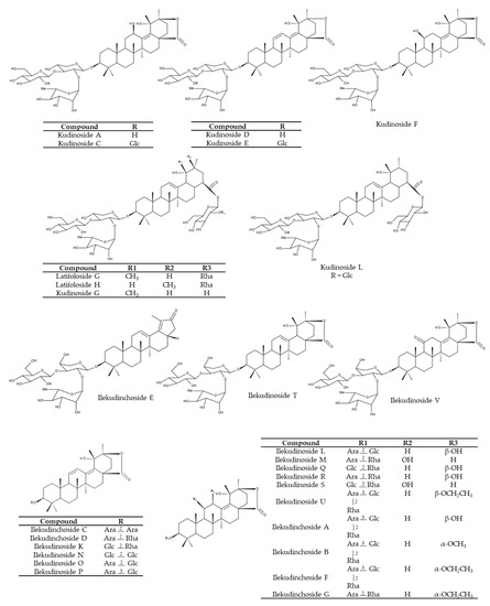 Triterpene saponins possessing ursane-type triterpenoids as aglycones are considered to be the most characteristic constituents of KT [1,22,27,28]. In addition, oleanane- and lupine-type triterpenoids and their glycosides are also present in KT [1]. A chemical analysis of 45 Ilex species indicated that I. kudingcha exhibited the highest content of saponins [13]. Comparing the content of five triterpenoid saponins (including α-, β- and γ-kudinlactones) tested in these 45 Ilex samples revealed some similarities within the same species but differences between the young and old leaves from the same species. Furthermore, differences among various species have been found [13]. Kudinosides C and A, both β-kudinlactones, are the main saponins present in I. latifolia, while kudinoside F (α-kudinlactone) and kudinoside D (γ-kudinlactone) were not found [13]. Feng et al. [29], in turn, determined 12 main saponins in I. latifolia, among them kudinosides D, A, H. Song et al. [5] identified 52 saponins in an aqueous extract of I. kudingcha, including the three major saponins: kudinosides A, D and F. The content of latifoloside G, kudinoside A and kudinoside G constitute such a large proportion (>80%), that these three molecules are suggested as suitable index compounds of total saponins in I. kudingcha, a relevant issue in quality control [15]. Over the years, researchers have isolated and identified a broad range of saponins, including kudinosides A-P [15,27,30,31,32], ilekudinosides A-T [15,30,33], latifolosides A-Q [15,28,30,31,33] and ilekudinchosides A-G and T-V [26,34,35,36] (Figure 5).