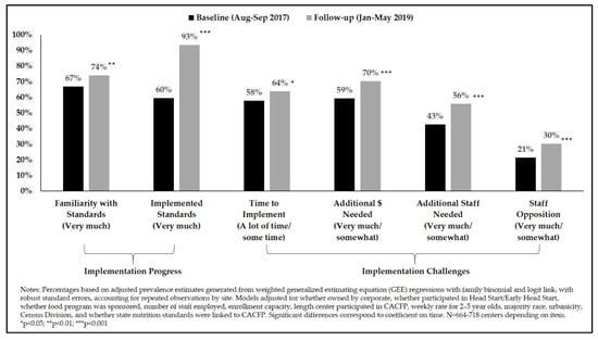 However, and contrary to our hypothesis, we found that centers reported more challenges with needing more time, money, and staff to support implementation of the standards from baseline to follow-up. While these challenges are consistent with reported challenges that ECE centers face with CACFP generally [7,8,21], it is possible that, at the time of the baseline survey (which occurred immediately prior to the implementation effective date), centers did not yet have a sense of the resources that would be required for implementation. Once they began implementation, however, they may have realized that they needed more resources to support implementation. Another explanation may be associated with the timing for implementation. Although USDA granted a phased-in approach to CACFP providers that were making a “good faith” effort to begin implementation, ECE programs generally do not have the benefit of a standard “shutdown” period like schools do where they are typically closed during the school year and have time to train and implement new standards. Many childcare centers operate continuously throughout the year, without a clear stop and start date, which could make changes more difficult to implement. Finally, while school food service directors have reported similar challenges when implementing revisions to the National School Lunch Program standards [22,23], they have also noted that, over time, they have been able to minimize the barriers [23] and increase participation in the program [24].