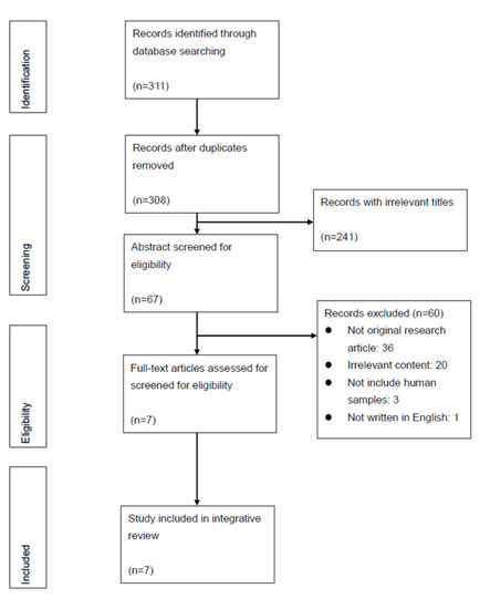 Initially, 311 articles were identified. After removing duplicates (n = 3), 308 articles were screened by title, which resulted in a total of 67 articles for abstract screening. Using the established criteria, 60 articles were excluded. Among the 60 articles, 60% (n = 36) were not complete original research articles; 33% (n = 20) presented irrelevant content; 5% (n = 3) did not include human samples; and 2% (n = 1) were not written in English. The remaining seven studies that were retained for full-text review were all included in the analysis (Figure 1).