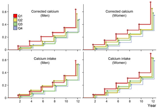 Cumulative incidence of significant muscle mass loss according to quartiles for corrected calcium level and daily calcium intake. Lower corrected calcium levels were significantly associated with loss of muscle mass (P < 0.001 using the log-rank test in both men and women). Daily calcium intake was associated with loss of muscle mass only among women (P = 0.004), not men (P = 0.124).